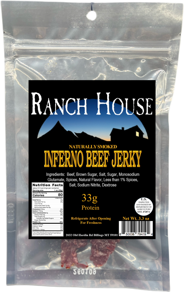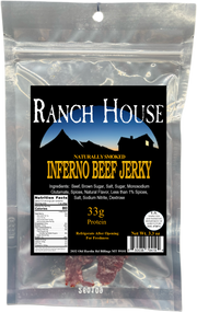 3.3 oz bag of inferno/habanero beef jerky. Shelf stable until opened. Eat or refrigerate within 3 days of opening to preserve flavor.