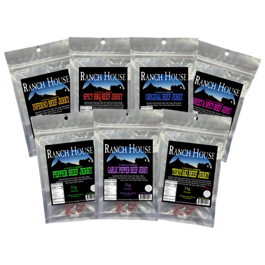 3.3oz bag of the following flavors: original, teriyaki, pepper, inferno, garlic pepper, spicy bbq, and sweet & spicy.