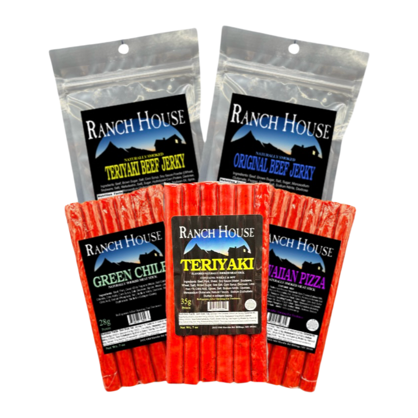 3 snack sticks: Teriyaki, Green Chile, and Hawaiian Pizza.