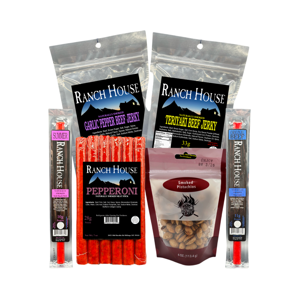 Filled with two bags of beef jerky (garlic pepper, teriyaki), one package of 7oz snack sticks (pepperoni), two servings of 2oz snack sticks (summer, original beef) and one bag of smoked pistachios (smoked)!
